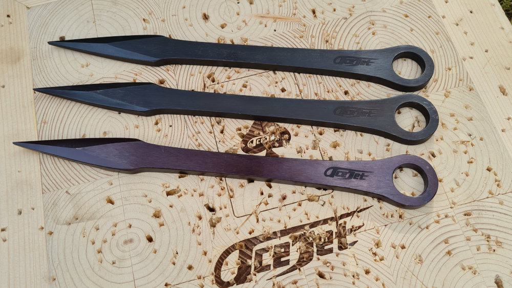 Diese geschwärzte Version des klassischen AceJet-Wurfmessers besteht aus dem gleichen Stahl wie die anderen Messer – dem gleichen hochwertigen Federstahl 14260, der gleichen Härtung und dem gleichen Schliff – der einzige Unterschied ist die schwarze Oberflächenbehandlung, die durch das Schwärzungsverfahren erreicht wird. Uns gefällt das Aussehen geschwärzter Messer sehr gut. Sie sehen rau aus, sind nicht so leicht verschmutzt, Rost greift sie nicht so leicht an und sie bleiben die gleichen erstaunlichen Wurfmesser, die wir gewohnt sind.