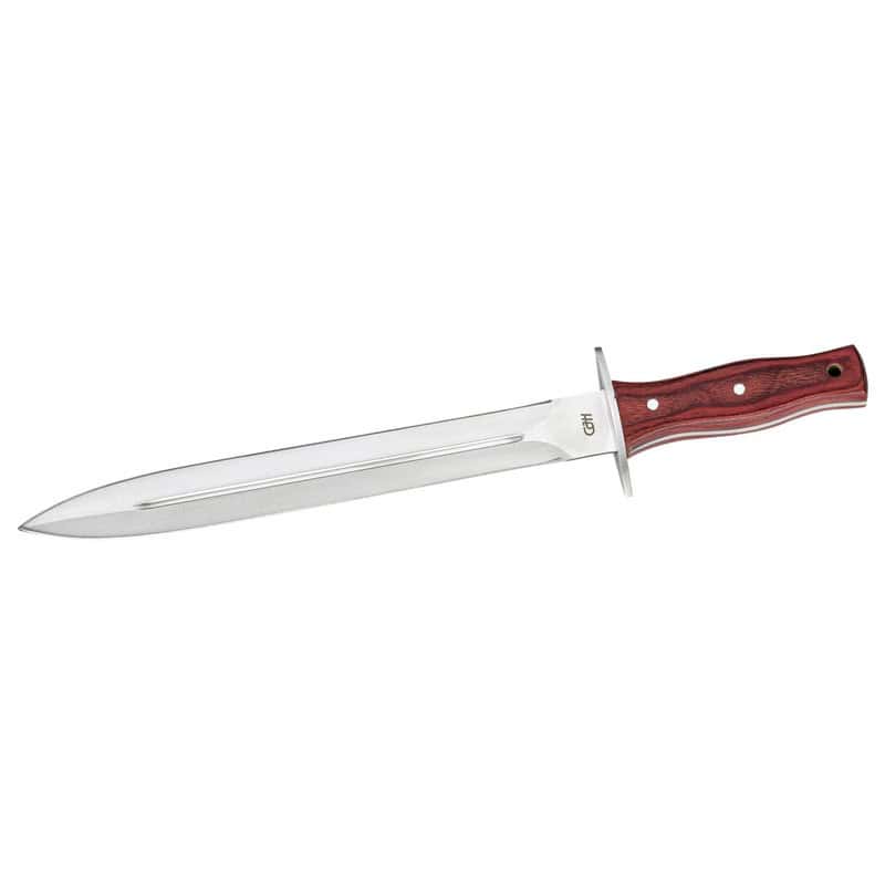 Der Dolch ist mit einer attraktiven Klinge aus rostfreiem AISI 420-Stahl ausgestattet. Dieser Stahltyp bietet dir eine gute Korrosionsbeständigkeit und ist leicht nachzuschärfen – Eigenschaften, die bei einem Messer dieser Größe wichtig sind. Mit einer Klingenlänge von 28,8 cm und einer Gesamtlänge von 40,8 cm ist dieser Dolch ein imposantes Stück. In der Jägerschaft wird er oft als Abfangmesser eingesetzt, was seine Stabilität und Größe unterstreicht.