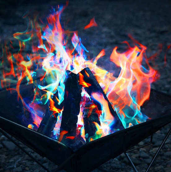 Diese Pulver enthalten Metallsalze, die, wenn sie verbrennen, die Flammen in verschiedenen leuchtenden Farben erscheinen lassen, anstatt des üblichen Gelb-Oranges.