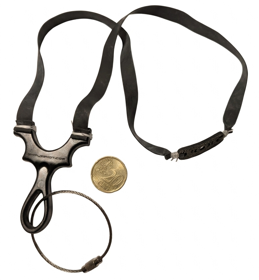 Aber lass dich von der Größe nicht veralbern. Das hier ist kein Kaugummi-Automat-Spielzeug. Hier arbeiten 0,5 mm dicke SimpleShot-Flachbandgummis. Das ist die Art von Material, aus dem Träume (und verbeulte Coladosen) gemacht sind. Kombiniert mit der Rapid Shooting Pouch, die deine Stahlkugeln so sicher festhält wie eine Helikopter-Mutter ihr Erstgeborenes im Supermarkt, wird hier Präzision neu definiert.