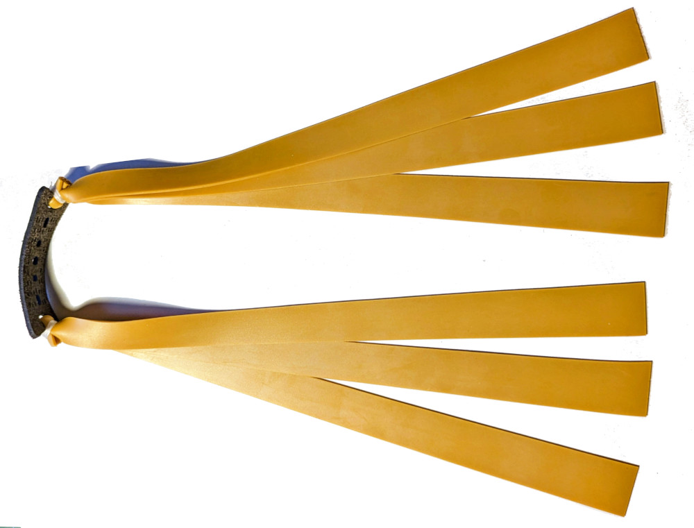 Duu erhältst hier ein 3mm starkes Doppelflachbandgummi – also 3x 1mm Flachbänder pro Strang – von hoher Qualität, selbstgebunden in meiner Zwillenmanufaktur aus PRECISE GOLD LATEX. Die XL-Pouch faßt Kugelgrößen von 10-14mm sicher und erlaubt eine präzise Schußkontrolle. Das Spezial-Latex wurde extra für Zwillen gefertigt. Die von Hand mit Spezial Schablone geschnittenen Bänder sind 25cm lang und laufen von 20 auf 10mm zu. Die Stärke des Zwillengummi-Bandsets ist etwas für NUR! wirklich, wirklich sehr starke Zwillunken!!!
